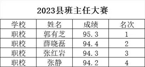 在2023年迁西县第十届班主任基本功大赛中,选拔出郭有芝、薛晓磊、张红岩、张静4名优秀班主任,经过才艺展示、情景答辩、育人故事、带班策略四项评审,包揽前四名。