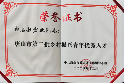 中共唐山市委人才工作领导小组命名赵宏业老师为唐山市第二批乡村振兴青年优秀人才。