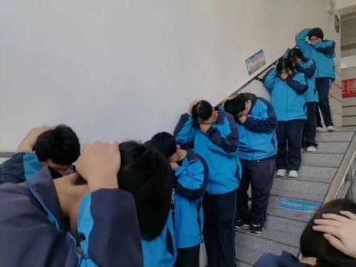震动稍停,教师们便组织学生按照预定疏散路线,双手抱头、弯腰低姿,快速有序地撤离教室。疏散引导组在各楼层关键位置严阵以待,他们用坚定的手势和清晰的指令,引导师生们安全疏散,确保整个疏散过程有条不紊。