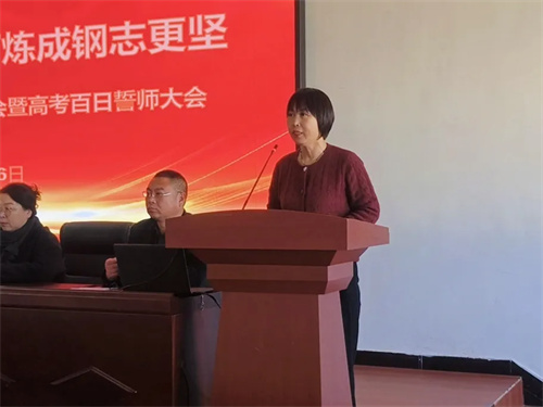 教师代表王翠宏老师从备考策略、心理调适等方面提出专业建议,强调“百日冲刺不仅是知识的比拼,更是心态的较量”。作为教师代表承诺全体教师将全力做好备考服务,与学生并肩作战,以更加严谨的教学态度、更加精湛的教学技艺、更加无私的奉献精神,陪伴学生们度过这关键的一百天,助力他们实现人生的梦想。