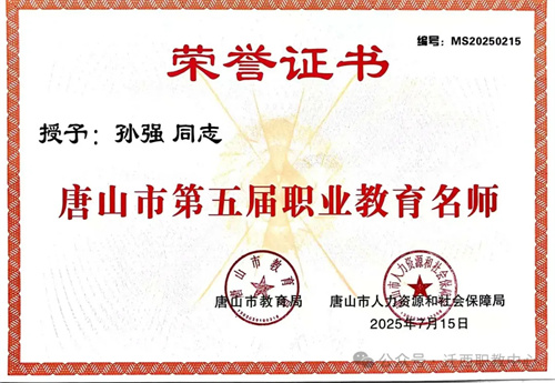 从县优秀教师到唐山市职业教育名师,从课题研究者到教材编写者,孙强老师用十九年坚守诠释着"四有"好老师的深刻内涵。在职业教育高质量发展的新征程上,他将继续以初心为笔、以担当为墨,书写新时代职教人的奋进篇章!