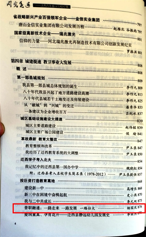 新华出版社《闪光的足迹——迁西百年奋斗历程纪实》(迁西县文史资料【第19辑】)。现将第三卷 改革开放篇・第四章 城建提速 教卫事业大发展 中刊登迁西职教中心的《普职融通:一路走来 一路发展 一路壮大》一文予以转载。